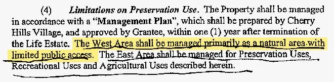 Cat loved this community and appreciated and understood the need to balance the community’s enjoyment of the property with the need to preserve its natural ecology and wildlife. . That’s why her conservation easement to Cherry Hills Village in fact does permit public access to the farm — east of the Highline Canal.