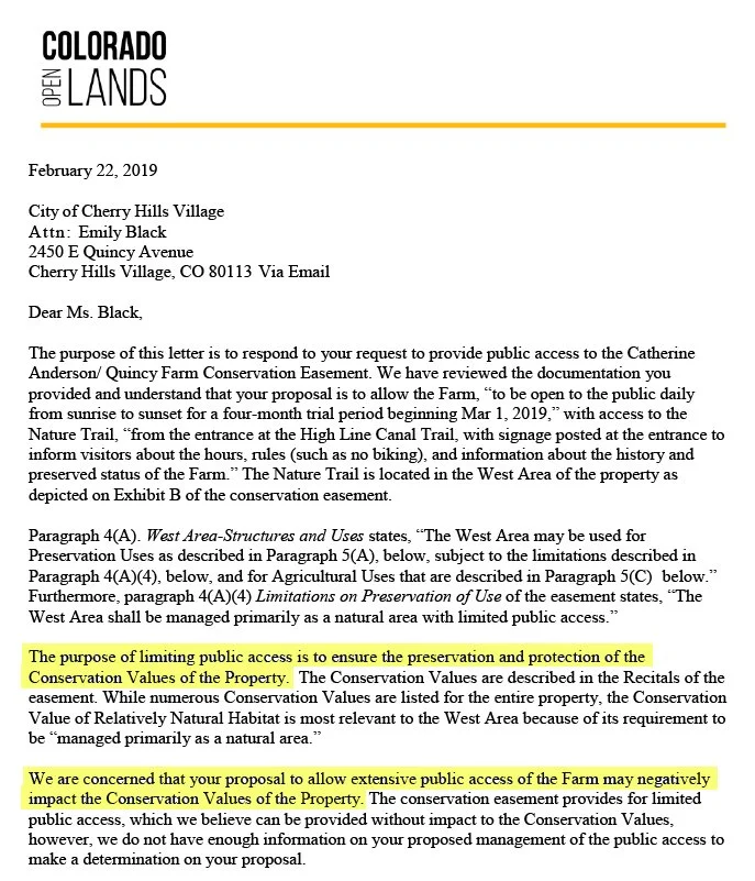 Among several communications to Cherry Hills Village, on February 22, 2019, Colorado Open Lands said that “We are concerned that your proposal to allow extensive public access of the Farm may negatively impact the Conservation Values of the Property.” Colorado Open Lands went further on July 2, 2019 to say “Unfortunately, we do not believe that the type and extent of public access in your proposal (sunrise to sunset, 7 days a week) is consistent with the conservation easement. Specifically, we do not believe it is ‘limited’ and is not consistent with the Preservation Uses as defined.”